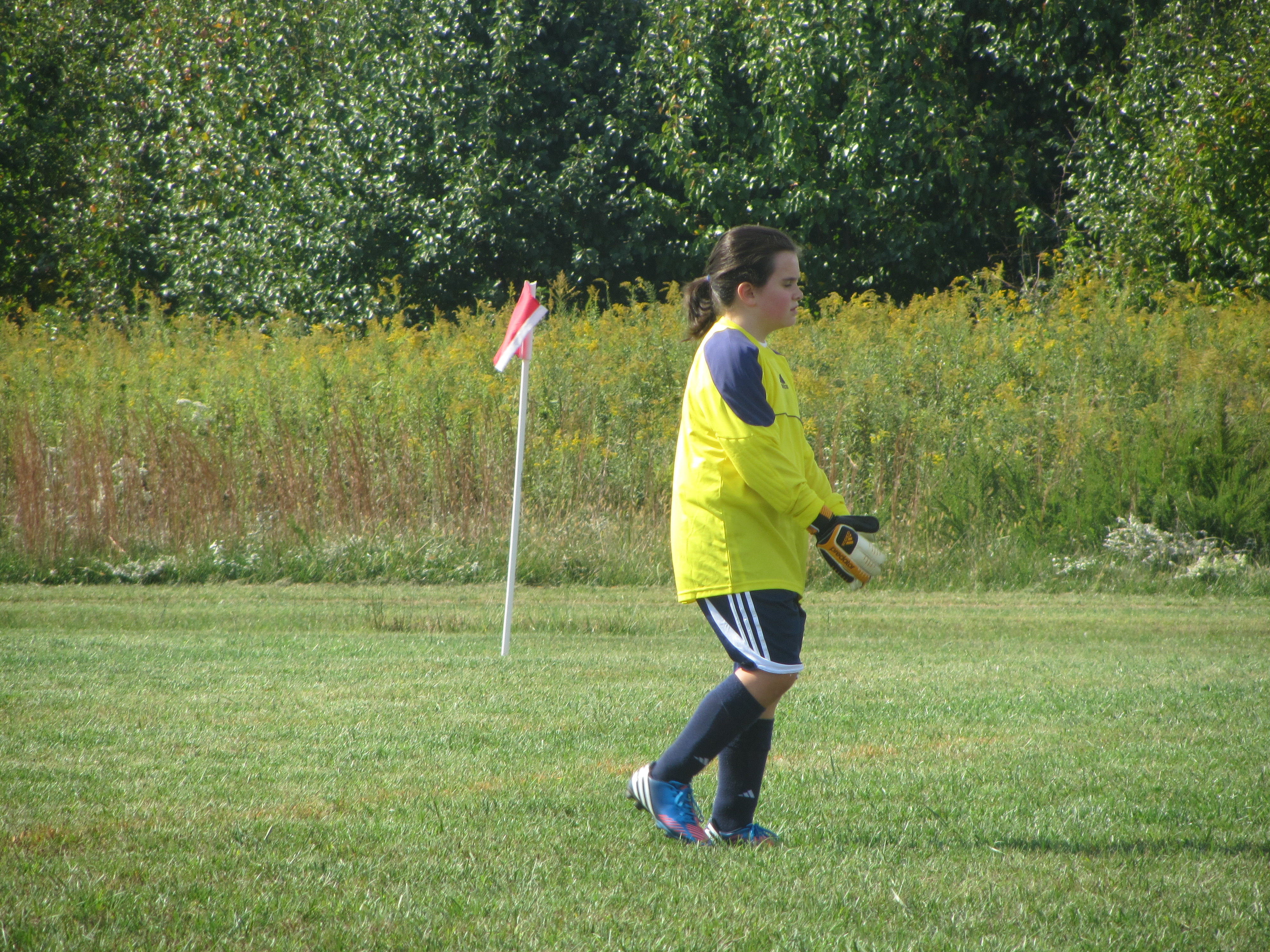 When we were leaving the fields for the day, coach whispered to my husband that they found the new starting goalie for the team. We went out to the sporting goods store for better gloves but of course no one carries anything in stock anymore so at home I placed an order for gloves with spines in the finger that supposedly protect from hyper extension. If she is going to play back there I have to do what I can to protect my baby. Would a football helmet be too much?