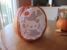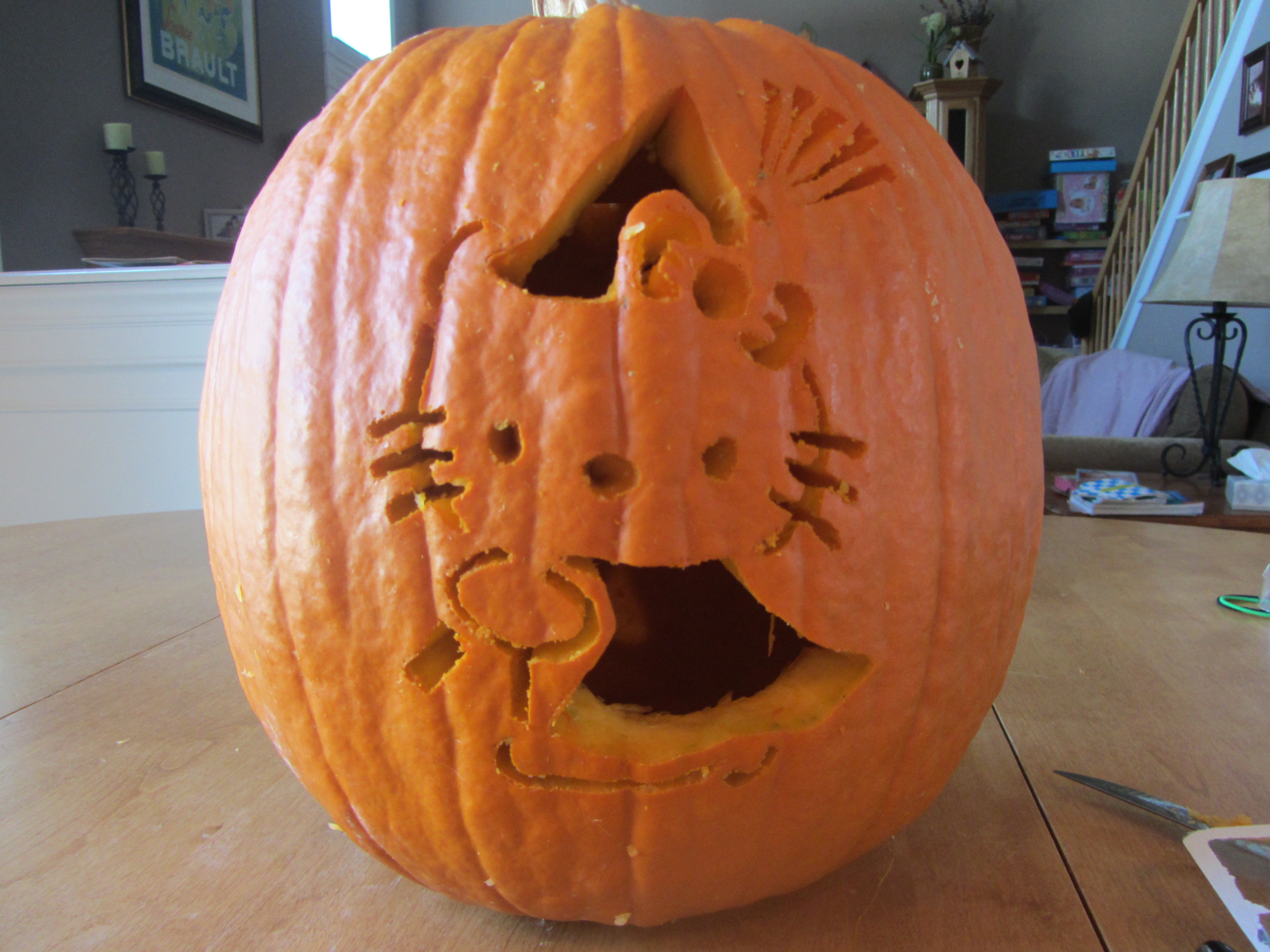The big project of the morning was the carving of my first ever Hello Kitty pumpkin.  Madison is obsessed with Kitty.  We printed the stencil from a website.  It took almost 2 hours to complete and a very cramped hand but we had success! I sprayed it with Aqua Net hair spray after I was finished in an attempt to preserve it for a while.  Aqua net can get ink out of carpets, seal a hair style for weeks so I was hoping it would extend the life of our pumpkin.