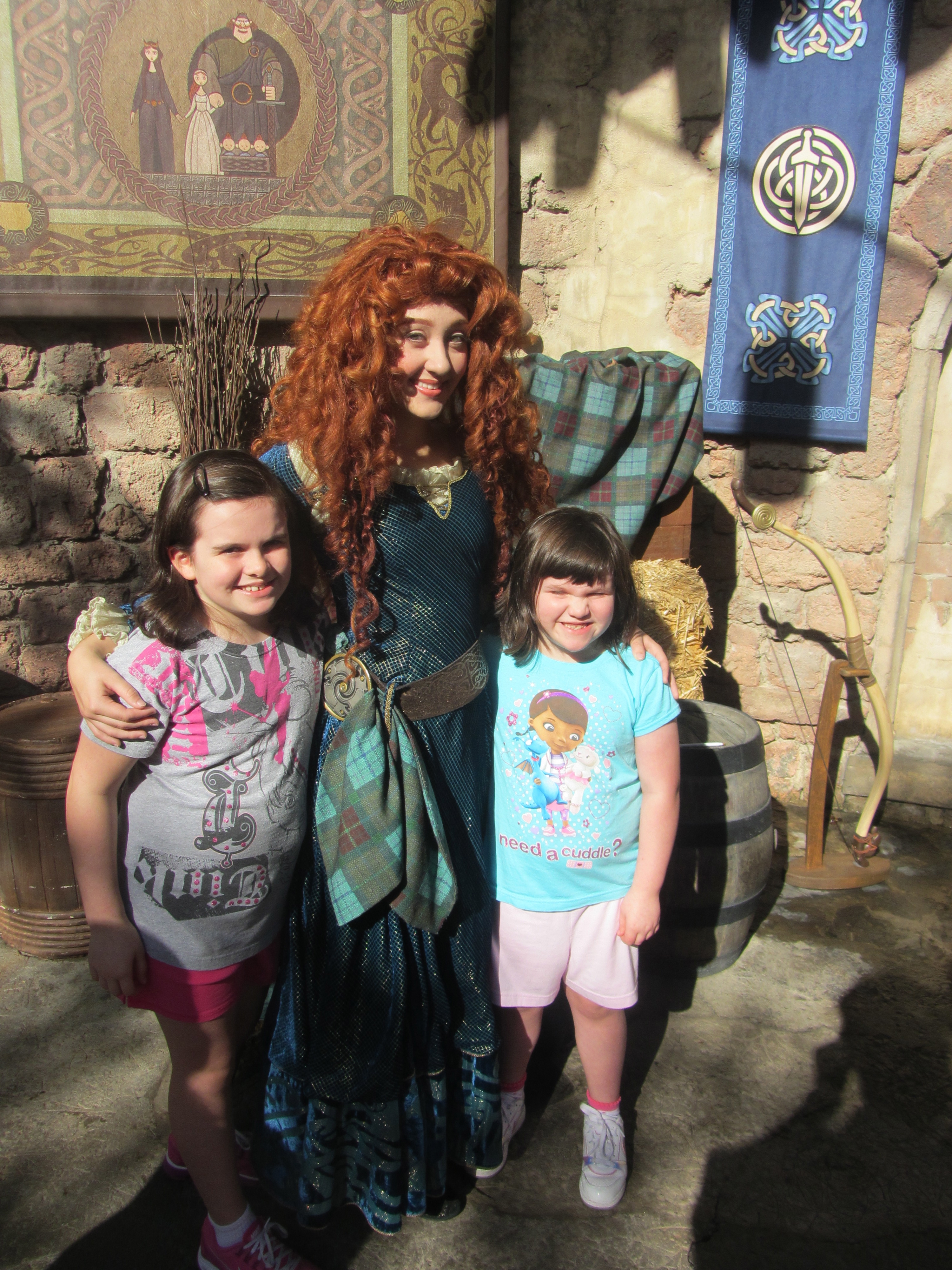 So as we sat in the hotel one night we had turned the television on but had never changed the channel. After a few minutes we realized we were watching the “things to do at Disney” channel. That is when we saw it, one of the newest character visits at the park was Merida from Brave. She has become important to my family. When I was in the hospital, Frank and the girls went to the movies and saw it together. It was one of the first nights while I was still in the ICU after the prophylactic mastectomy. The girls got a bit emotional as they drew connections between struggles with Merida’s mother and their own.