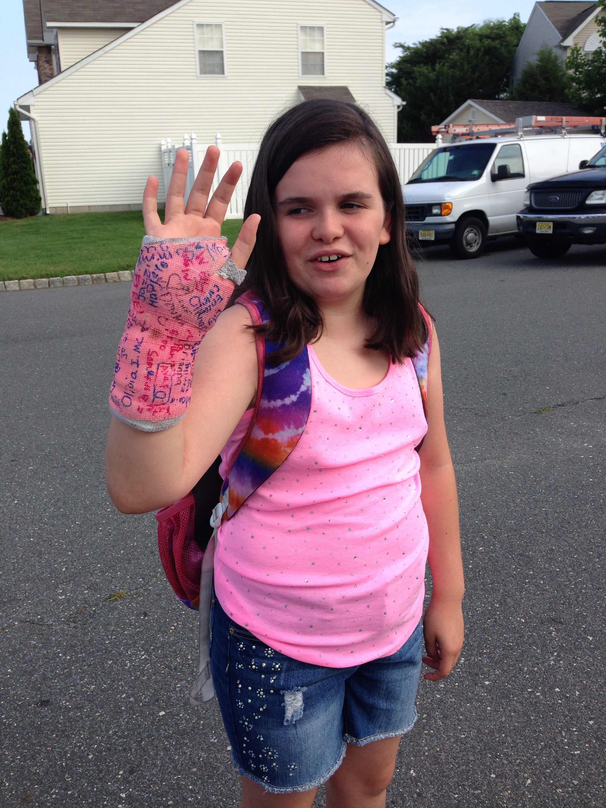 At the end of May I received an emergency phone call from school to pick-up Megan after a recess accident. During a kick ball game she had run into another student and had fallen. She hit her head on the concrete and was cut up pretty good. An urgent care visit and many tears later we realized we had our first broken bone of the family. Much celebration came when the cast was off at the end of June in time for swimming.