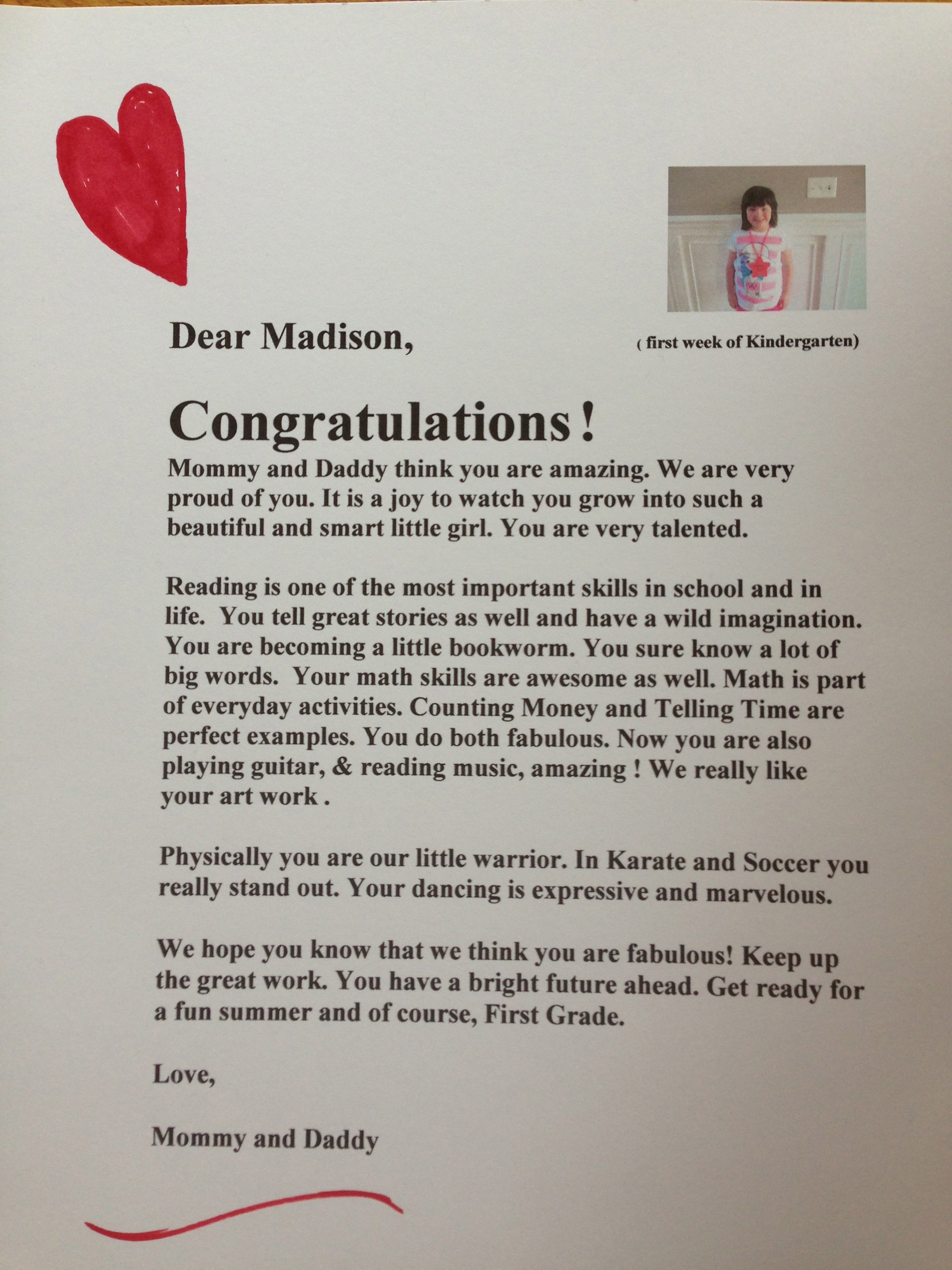 Before Madison left for school yesterday, she was greeted to breakfast by a note written by her father at her place at the table.  He actually started working on it weeks ago and asked me for a picture from the fist week of school. She read it while chopping on a banana.   I feel that you can never express enough the love we feel for our kids. From someone who grew up rarely hearing the words “I love you”, I have come to learn, you can never say them enough!